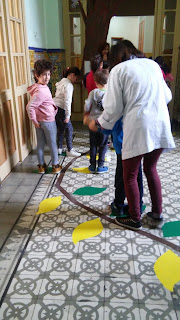 Las fisioterapeutas de centro y los profesores de E.F. han organizado un recorrido por los pasillos de la planta baja del centro en el que distintos símbolos nos indican como desplazarnos: gateando, reptando, a la pata coja....